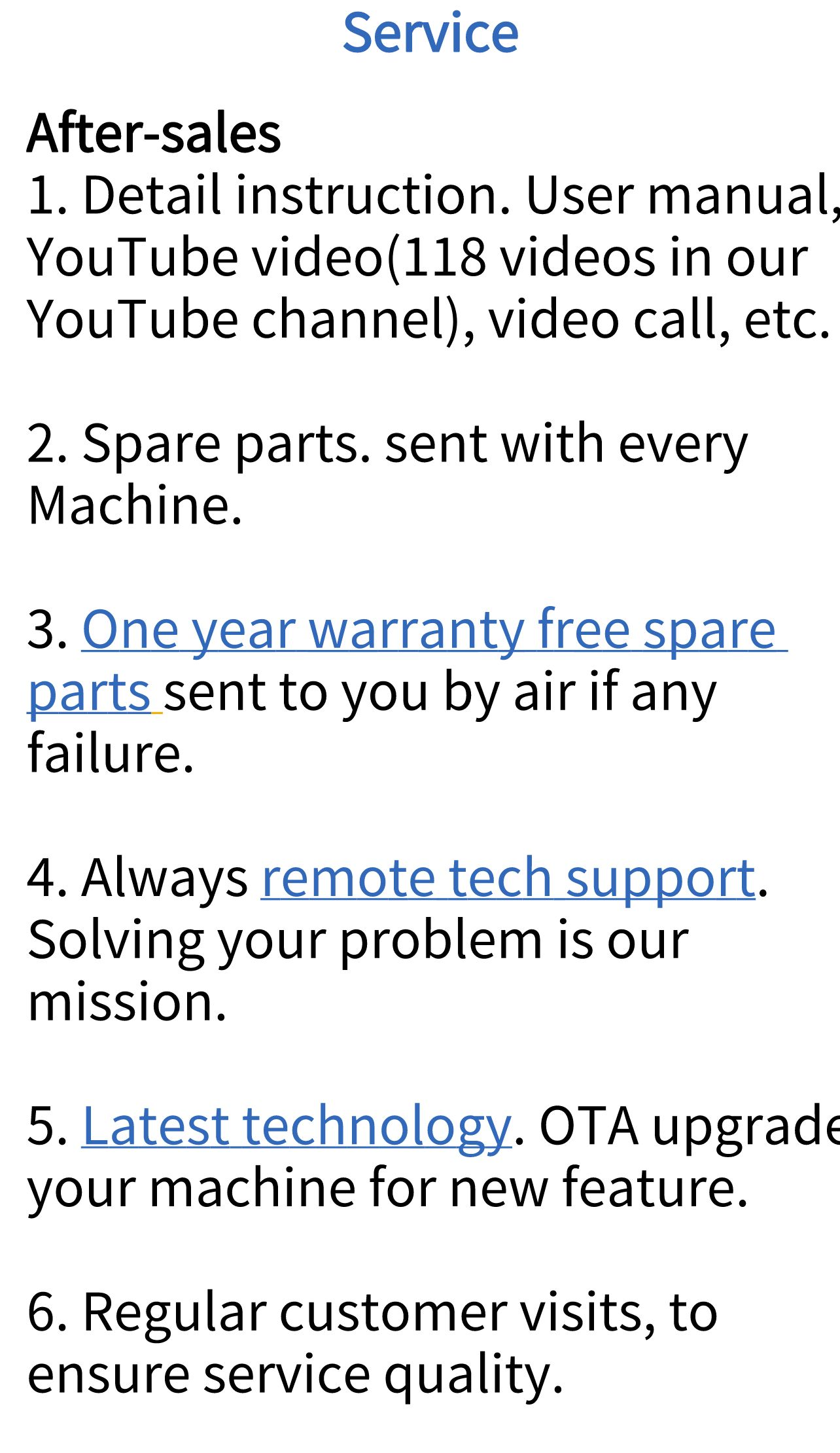5. Do you provide after-sales service/ product warranty? We provide one year warranty. Free spare parts within one year, and life time remote tech support. We handle software maintain for your machine.
